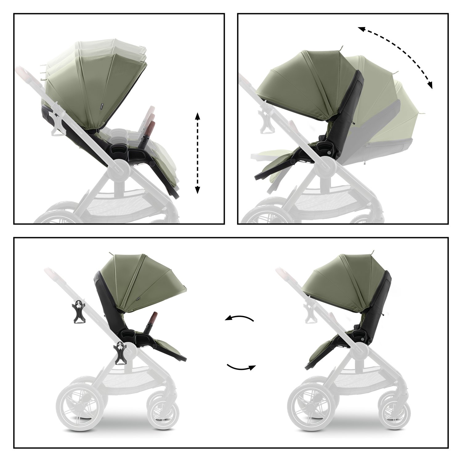 POHODLNÉ SEDÁTKO SE DVĚMA SMĚRY POHLEDU // Na zmrzlinu, na kávu či do parku: všude se vám kočárek dokonale přizpůsobí díky výškově nastavitelnému otočnému sedátku, navíc s extra dlouhým sezením a polohováním poskytuje maximální pohodlí v každé situaci.