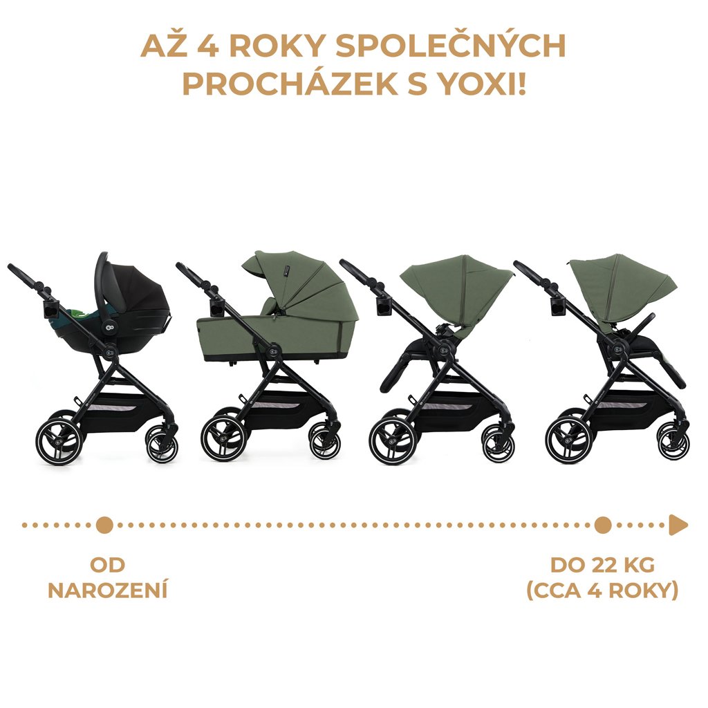Stačí jediný pohled, abyste si YOXI zamilovali. Jedná se o multifunkční kočárek 2 v 1, který vás bude provázet na procházkách od narození dítěte až do 4 let (22 kg). Je neobyčejně obratný a velmi snadno se s ním manévruje. Na samém začátku budete dítě vozit v pohodlné hluboké korbičce s měkkou matrací a velkou nepromokavou stříškou s filtrem UPF50+, u které lze shrnout látku tak, že dítě má panoramatický výhled, když leží na břiše. Až vaše dítě povyroste, můžete korbičku složit naplocho a uložit ji do skříně – a na jejím místě vás přivítá sportovní sedačka, kterou lze připnout po i proti směru jízdy. Kočárek se snadno a rychle skládá s připnutou sedačkou. Široká škála nastavení vám umožní přizpůsobit YOXI nejen vašemu dítěti, ale i sobě. A díky neprorazitelným kolečkům budete vždy připraveni na procházku. Kola v YOXI se nemusí nafukovat! Ke kočárku patří také řada praktického příslušenství, jako je moskytiéra, chránič na nohy dítěte, pláštěnka, držák na nápoje, taška na rukojeť pro rodiče a adaptéry na autosedačku. Pokud již máte dětskou autosedačku, můžete z ní díky adaptérům vytvořit TRAVEL SYSTEM. A to vše v jednom kočárku! Fusak Jibot 3v1 Horizontal Ink Black je součástí balení. Jeden kočárek – mnoho možností Dětský kočárek YOXI 2 v 1 byl vytvořen pro děti od narození do 22 kg. Zpočátku poslouží vašemu dítěti jako hluboký kočárek s prostornou korbičkou a později jako pohodlný sportovní kočárek, který lze připnout po i proti směru jízdy. Z YOXI lze vytvořit TRAVEL SYSTEM. Lehký a obratný YOXI v sobě snoubí design a funkčnost. Jednoduše se s ním manévruje a díky jeho obratnosti se snadno vyhnete jakékoli překážce. Má odpružený hliníkový rám a neprorazitelná kola, která není třeba nafukovat. Přední kola zablokujete pro jízdu vpřed – ideální pro jízdu v obtížnějším terénu, například při procházkách po parkových stezkách. Ideální pro nemluvňata Dětský kočárek YOXI je určen pro nemluvňata. Na vaše dítě čeká velká, pohodlná korba s měkkou matrací a chráničem pro chladnější dny. Ventilační síťky poskytnou dítěti ležícímu na břiše panoramatický výhled na svět. Až vaše dítě z korby vyroste, můžete ji snadno složit naplocho a uložit do skříně. Ochrana proti nepříznivým atmosférickým podmínkám Stříšky na sportovním kočárku i sportovní verzi jsou velké, s ventilací a filtrem UPF50+. Jsou nepromokavé a mají dodatečný ventilační panel, ideální pro horké dny. Kompletní regulace pro lepší přizpůsobení U kočárku YOXI můžete nastavit opěrku nohou i opěrku zad. Vytvoříte tak pohodlný prostor pro zdřímnutí dítěte během procházek. YOXI se přizpůsobí i vám: nastavitelná rodičovská rukojeť vám umožní přizpůsobit kočárek vaší výšce. Na procházku i odpočinek Sedačka YOXI je ve správné výšce, aby bylo možné kočárek přistavit ke stolu. Kočárek lze složit jedním pohybem – skládá se dovnitř, díky tomu se látka kočárku při přenášení neušpiní. Ještě více funkcí MEMORY BUTTONS SYSTEM umožňuje rychlé odepnutí sportovní sedačky a korby od konstrukce – pouze jednou rukou. Magnetická spona pásů usnadní upevnění dítěte v kočárku. A pokud máte dětskou autosedačku, můžete z ní díky přiloženým adaptérům vytvořit TRAVEL SYSTEM. Vše po ruce Objemný koš s nosností až 5 kg pojme veškeré potřebné příslušenství. Deka a pleny navíc? A co nákupy, které jste udělali po cestě domů? Snadný přístup z obou stran vám umožní rychle vytáhnout jakoukoli věc. Ke kočárku je dodáváno také příslušenství: moskytiéra (v opěrce nohou, kterou budete mít vždy s sebou), chrániče na nohy, pláštěnka, držák na nápoje, taška na rukojeť pro rodiče a adaptéry na autosedačku. Technické parametry: Materiály: - rám: hliník - potah: polyester - adaptéry: plast - kola: gumová s pěnovou výplní - matrace: polyester - taška pro rodiče: polyester - maximální hmotnost dítěte: 22 kg - maximální zatížení koše: 5 kg Rozměry: - rozměry rozloženého kočárku: 97/89 D x 59 Š x 107 V - rozměry složeného kočárku: 31 D x 59 Š x 73 V - hmotnost: 11 kg (CS) Týká se korby: UPOZORNĚNÍ! Tento výrobek je určen pro děti, které nemohou sedět bez pomoci, obracet se anebo chodit po čtyřech. Maximální hmotnost dítěte: 9 kg. UPOZORNĚNÍ! Nikdy nepokládejte toto přenosné lůžko na nosnou konstrukci. Výrobek je určen pro děti o hmotnosti / věku: gondola od narození do 9 kg, kočárek od 0 měsíců do 22 kg nebo do 4 let, podle toho, co nastane dříve. UPOZORNĚNÍ! Tento výrobek není vhodný pro běhání nebo jízdu na bruslích. Adresa dodavatele: Supl4kraft sp. z o.o. ul. Tatrzanska 1/5, 60-413 Poznan, Poland support@kinderkraft.com www.kinderkraft.com