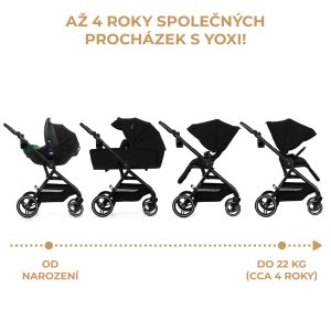 S YOXI budou každodenní výzvy rodičovství jednodušší. Jedná se o multifunkční kočárek 3 v 1, který vás bude provázet od prvních dní života vašeho dítěte. Je lehký, obratný a velmi snadno ovladatelný. Kočárek YOXI obsahuje velkou korbičku s měkkou matrací a velkou, nepromokavou stříškou z materiálu UPF50+ s panoramatickým výhledem a sportovní sedačku, kterou lze instalovat ve směru nebo proti směru jízdy. YOXI můžete jednoduše složit i se sedačkou – je lehký, takže jej snadno přenesete i po schodech. Kočárek má nastavitelné opěradlo a opěrku na nohy: je ideální pro spánek na čerstvém vzduchu. Díky úplnému odpružení a velkým kolům, které není třeba pumpovat, bude vaše dítě v pohodlí i na nerovném terénu. Ke kočárku patří praktické doplňky: moskytýra v opěrce nohou, pláštěnka, nánožník , držák na lahev, přebalovací taška a adaptéry na autosedačku, díky kterým můžete vytvořit TRAVEL SYSTEM, autosedačka je součástí balení. A to vše v jednom kočárku. Fusak Jibot 3v1 Horizontal Ink Black je součástí balení. Po celou dobu, po kterou budete kočárek používat Kočárek YOXI 3 v 1 byl vytvořen pro děti od narození do přibližně 4 let (22 kg). Velká pohodlná korba s měkkou matrací byla navržena speciálně pro miminka, a když dítě vyroste, můžete ji jednoduše vyměnit za sportovní sedačku, kterou lze používat ve směru nebo proti směru jízdy. Lehký a obratný YOXI se velmi snadno ovládá – ať už na chodnících, nebo na náročnějším terénu. Má hliníkový rám s odpružením a kola odolná proti propíchnutí, která není třeba pumpovat. Přední kola lze uzamknout pro pohodlnější pohyb na nerovném terénu. Perfektní již od narození Kočárek YOXI byl navržen s ohledem na potřeby dětí. Korba je prostorná, vybavená měkkou matrací a nánožníkem na chladnější dny. Stříška obsahuje ventilační síťku, která zároveň poskytuje dítěti ležícímu na bříšku panoramatický výhled na svět. Korba lze složit naplocho. Do jakýchkoli povětrnostních podmínek Stříšky na sportovní sedačce i korbičce jsou velké a vyrobeny z materiálu UPF50+ s ventilační síťkou. Obě jsou nepromokavé a můžete odkrýt i dodatečný panel, který je ideální pro opravdu horké dny. Spousta možností nastavení Na sportovní sedačce YOXI lze nastavit opěrku na nohy i opěradlo. Kočárek můžete přizpůsobit potřebám vašeho dítěte, čímž vytvoříte prostor pro spánek na čerstvém vzduchu nebo ideální místo pro pozorování světa. YOXI se přizpůsobí i vám: nastavitelná rukojeť umožní upravit výšku kočárku dle vaší potřeby. Multi-tasking YOXI se přizpůsobí vašemu životnímu stylu. Sedačka je ve výšce vhodné pro snadné přisunutí kočárku ke stolu, například v restauraci. Kočárek YOXI můžete složit jediným pohybem: skládá se směrem dovnitř, díky čemuž se látka nezašpiní, když jej přenášíte. Technické parametry: - Věk/váha/výška dítěte: 0-22 kg - Rozložený kočárek (sportovní sedačka): 107 x 89 x 59 cm - Rozložený kočárek (korba): 107 x 97 x 59 cm - Složený kočárek: 59 x 31 x 73 cm - Délka vaničky – vnější: 79 cm - Složená korba: 43 x 88 x 17,5 cm - Průměr předních kol: 17 cm - Průměr zadních kol: 25 cm