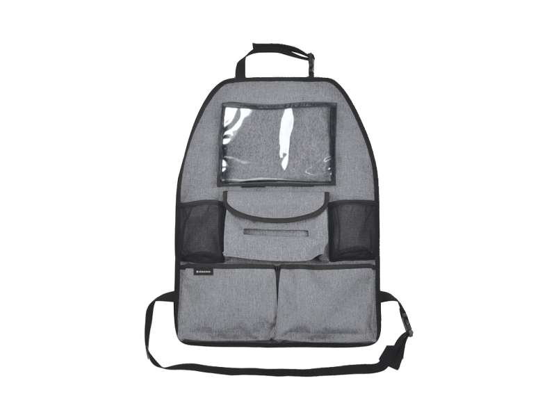 Praktický organizér na zadní stranu sedadla poskytuje prostor pro přehledné uložení všeho, čím chcete zabavit vaše dítě během cestování autem. Do průhledné kapsy s dotykově citlivou fólií můžete vložit tablet. Tablet dítě zabaví během dlouhé cesty, organizér jej přitom chrání před poškozením. Organizér dále nabízí pouzdro na kapesníky, dva držáky na nápoje a dvě velké kapsy pro další potřeby na cestování a zabavení dítěte. Pevný, omyvatelný materiál chrání sedadlo před okopáním a ušpiněním. Organizér se snadno přichytí k přednímu sedadlu s pomocí univerzálních úchytů.  Rozměry: 59,5 x 43 cm