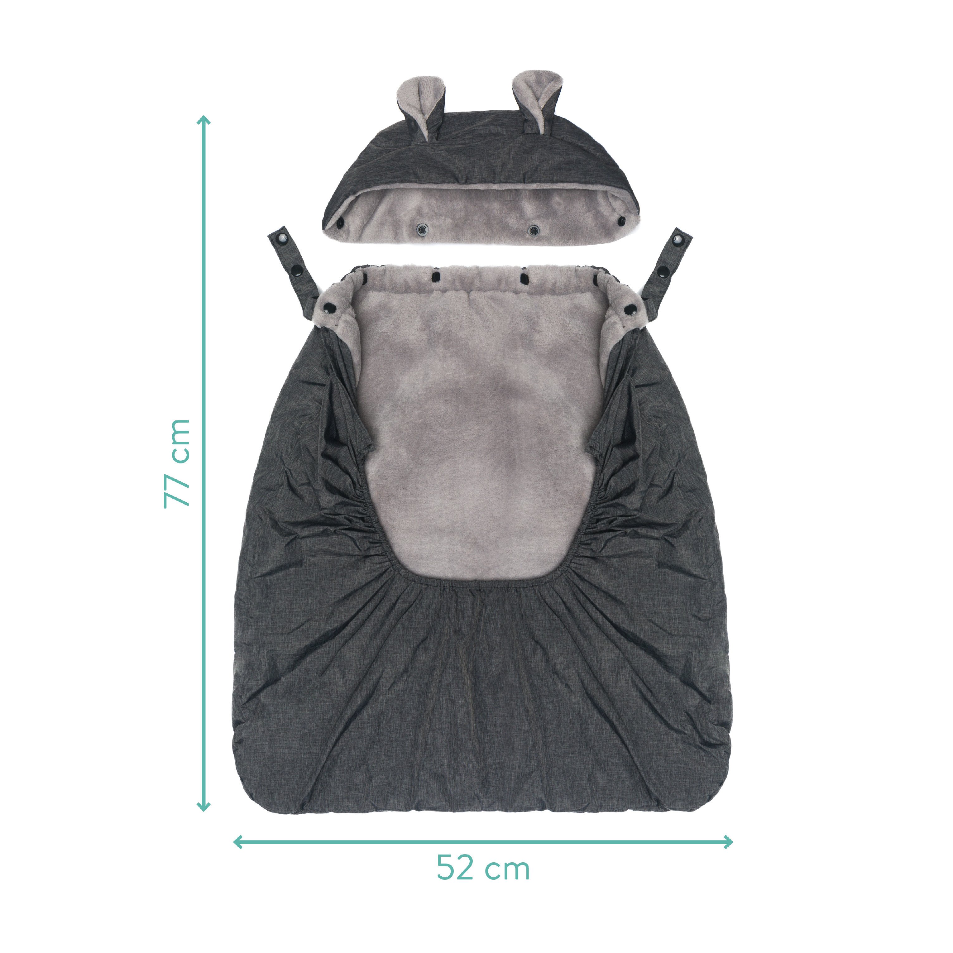 Odnímatelná kapuce s malými oušky dává krytu obzvlášť roztomilý vzhled a zároveň chrání citlivou hlavičku Vašeho miminka. Praktická přední kapsa zahřeje Vaše ruce a nabízí prostor na drobnosti.