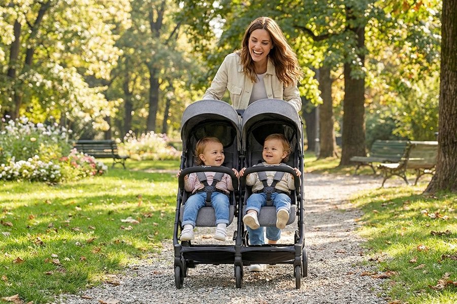 Lehký a kompaktní kočárek pro dvojčata v šedé barvě, dobře jej využijete také pro věkově blízké sourozence. Vhodný již od narození.