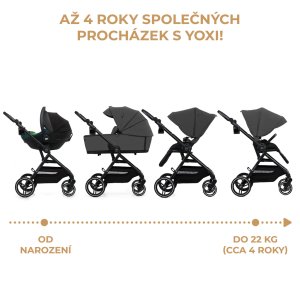 S YOXI budou každodenní výzvy rodičovství jednodušší. Jedná se o multifunkční kočárek 3 v 1, který vás bude provázet od prvních dní života vašeho dítěte. Je lehký, obratný a velmi snadno ovladatelný. Kočárek YOXI obsahuje velkou korbičku s měkkou matrací a velkou, nepromokavou stříškou z materiálu UPF50+ s panoramatickým výhledem a sportovní sedačku, kterou lze instalovat ve směru nebo proti směru jízdy. YOXI můžete jednoduše složit i se sedačkou – je lehký, takže jej snadno přenesete i po schodech. Kočárek má nastavitelné opěradlo a opěrku na nohy: je ideální pro spánek na čerstvém vzduchu. Díky úplnému odpružení a velkým kolům, které není třeba pumpovat, bude vaše dítě v pohodlí i na nerovném terénu. Ke kočárku patří praktické doplňky: moskytýra v opěrce nohou, pláštěnka, nánožník , držák na lahev, přebalovací taška a adaptéry na autosedačku, díky kterým můžete vytvořit TRAVEL SYSTEM, autosedačka je součástí balení. A to vše v jednom kočárku. Fusak Jibot 3v1 Horizontal Ink Black je součástí balení. Po celou dobu, po kterou budete kočárek používat Kočárek YOXI 3 v 1 byl vytvořen pro děti od narození do přibližně 4 let (22 kg). Velká pohodlná korba s měkkou matrací byla navržena speciálně pro miminka, a když dítě vyroste, můžete ji jednoduše vyměnit za sportovní sedačku, kterou lze používat ve směru nebo proti směru jízdy. Lehký a obratný YOXI se velmi snadno ovládá – ať už na chodnících, nebo na náročnějším terénu. Má hliníkový rám s odpružením a kola odolná proti propíchnutí, která není třeba pumpovat. Přední kola lze uzamknout pro pohodlnější pohyb na nerovném terénu. Perfektní již od narození Kočárek YOXI byl navržen s ohledem na potřeby dětí. Korba je prostorná, vybavená měkkou matrací a nánožníkem na chladnější dny. Stříška obsahuje ventilační síťku, která zároveň poskytuje dítěti ležícímu na bříšku panoramatický výhled na svět. Korba lze složit naplocho. Do jakýchkoli povětrnostních podmínek Stříšky na sportovní sedačce i korbičce jsou velké a vyrobeny z materiálu UPF50+ s ventilační síťkou. Obě jsou nepromokavé a můžete odkrýt i dodatečný panel, který je ideální pro opravdu horké dny. Spousta možností nastavení Na sportovní sedačce YOXI lze nastavit opěrku na nohy i opěradlo. Kočárek můžete přizpůsobit potřebám vašeho dítěte, čímž vytvoříte prostor pro spánek na čerstvém vzduchu nebo ideální místo pro pozorování světa. YOXI se přizpůsobí i vám: nastavitelná rukojeť umožní upravit výšku kočárku dle vaší potřeby. Multi-tasking YOXI se přizpůsobí vašemu životnímu stylu. Sedačka je ve výšce vhodné pro snadné přisunutí kočárku ke stolu, například v restauraci. Kočárek YOXI můžete složit jediným pohybem: skládá se směrem dovnitř, díky čemuž se látka nezašpiní, když jej přenášíte. Technické parametry: - Věk/váha/výška dítěte: 0-22 kg - Rozložený kočárek (sportovní sedačka): 107 x 89 x 59 cm - Rozložený kočárek (korba): 107 x 97 x 59 cm - Složený kočárek: 59 x 31 x 73 cm - Délka vaničky – vnější: 79 cm - Složená korba: 43 x 88 x 17,5 cm - Průměr předních kol: 17 cm - Průměr zadních kol: 25 cm
