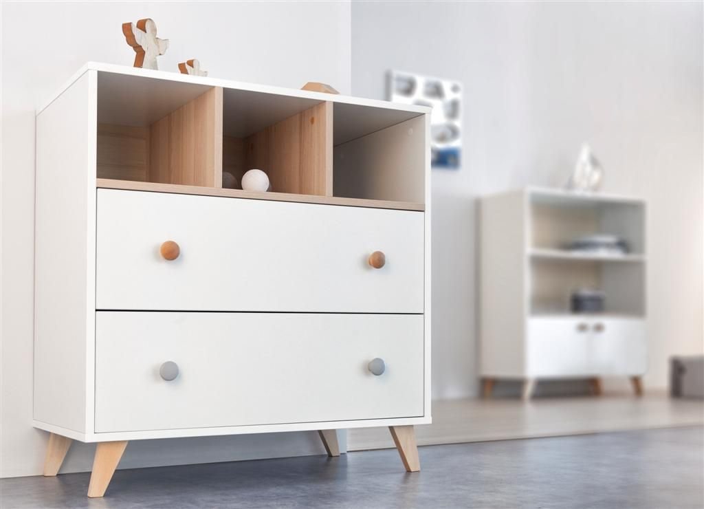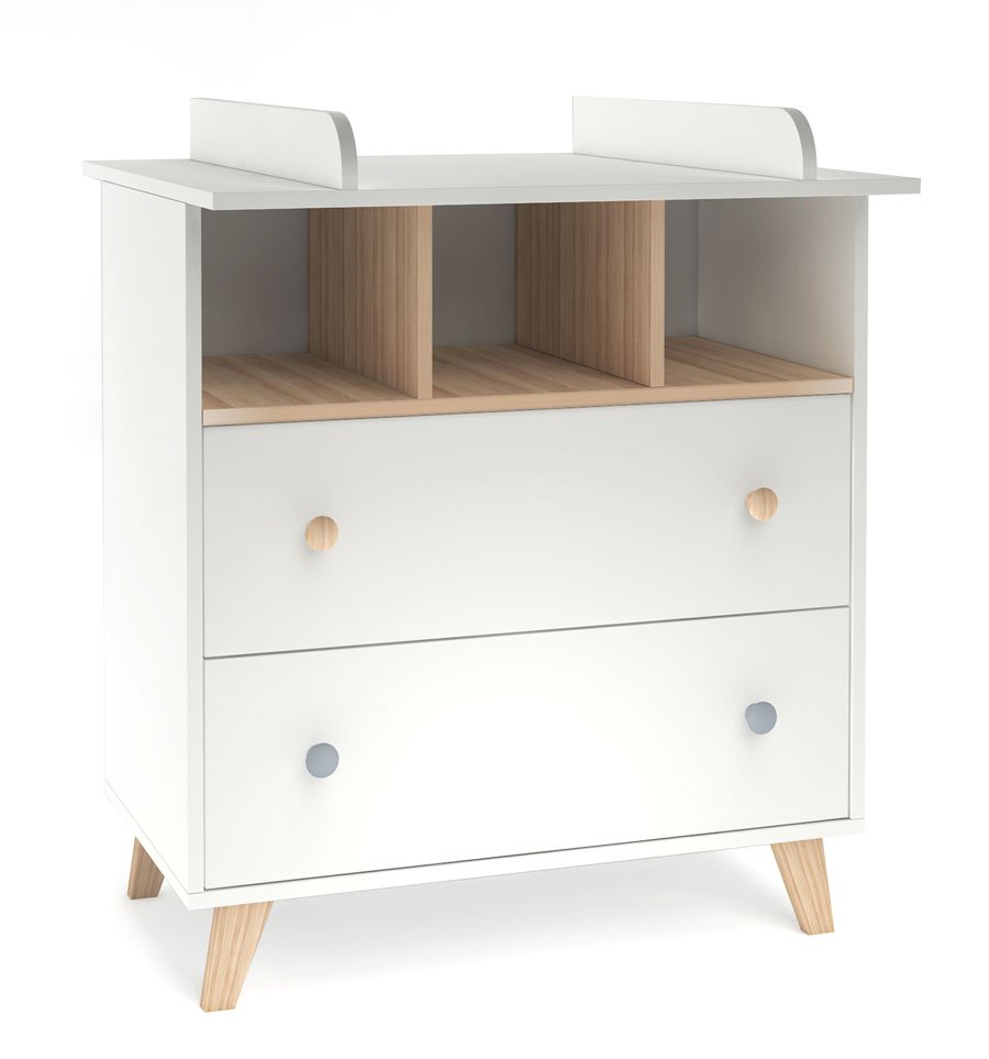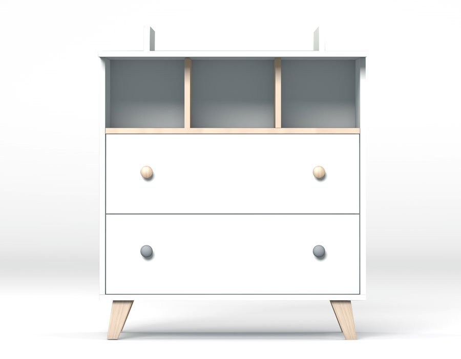 Komoda poskytne dostatek místa na vše potřebné pro Vaše miminko, v horní části otevřená polička pro velmi frekventované potřeby nebo pro věcí, po kterých potřebujete sáhnout ospalá poslepu, níže dva šuplíky chránící věci před prachem. Komoda je optimálně vysoká pro pohodlné přebalování. Součástí dodávky je přebalovací nástavec, který později můžete odmontovat a komodu dále používat bez něj.