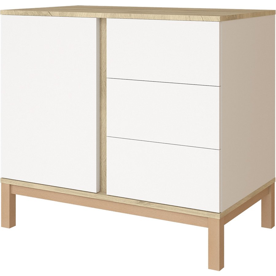 Nezbytný prvek dětského pokoje. Byla navržena tak, aby se vešla do relativně malého prostoru, ale přesto nabídla novopečeným rodičům tu největší možnou pomoc. Její výška, úložné plochy a variabilita byly navrženy na základě zkušeností rodičů.  Slouží nejen jako úložný prostor, ale horní část komody lze pomocí přebalovacího nástavce na komodu ( který je součástí dodávky) využít jako přebalovací pult.